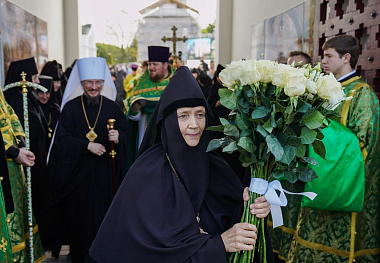 Настоятельница монастыря игумения Евдокия (Левшук) также приветствовала Предстоятеля Русской Церкви и преподнесла в дар Его Святейшеству икону преподобной Евфросинии Полоцкой, написанную сестрами обители.