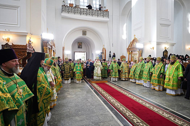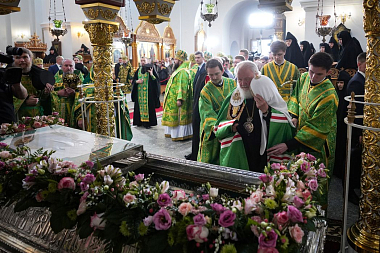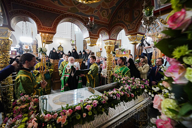 Святейший Патриарх Кирилл проследовал в Крестовоздвиженский собор обители, где поклонился мощам преподобной Евфросинии Полоцкой, которые покоятся в воссозданной серебряной раке, а затем возглавил служение Божественной литургии.