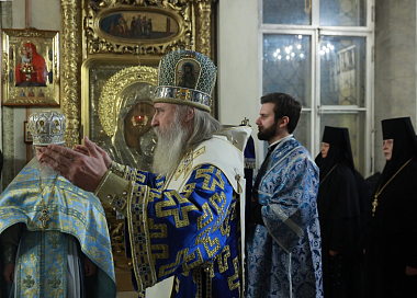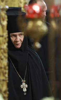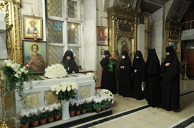 За богослужением молились заместитель председателя Синодального отдела по монастырям и монашеству, настоятельница Зачатьевского ставропигиального женского монастыря игумения Иулиания (Каледа), настоятельница Богородице-Рождественского ставропигиального женского монастыря игумения Викторина (Перминова), настоятельница Покровского ставропигиального женского монастыря игумения Феофания (Мискина).