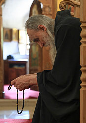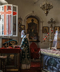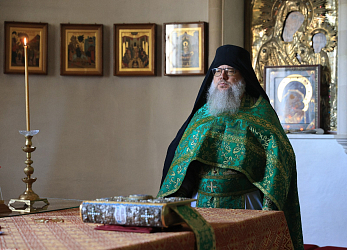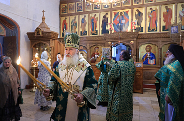 Перед началом богослужения митрополит Феогност поклонился честным мощам преподобного Аристоклия, старца Афонского и Московского.