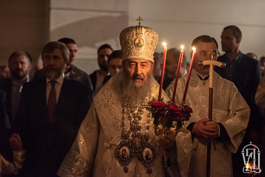 Вечером 28 апреля 2018 года, в праздник Светлого Христова Воскресения, митрополит Киевский и всея Украины Онуфрий совершил вечернее богослужение в Успенском соборе Свято-Успенской Киево-Печерской Лавры.