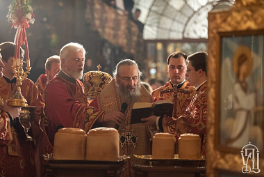 Его Блаженству сослужили наместник Киево-Печерской лавры митрополит Вышгородский и Чернобыльский Павел, управляющий делами Украинской Православной Церкви митрополит Бориспольский и Броварской Антоний, архиепископ Бучанский Пантелеимон, епископ Барышевский Виктор, епископ Белогородский Сильвестр, гости в священном сане и духовенство монастыря.