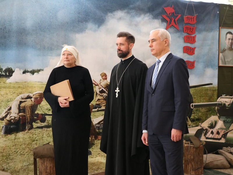 Экспозиция рассказывает о наших земляках – участниках Великой Отечественной войны, многие из которых, пережив все испытания трагических лет, в мирное время посвятили свою жизнь Богу, став священниками и монахами. Десятки фотографий, документы, письма с фронта воссоздают атмосферу военных лет и рассказывают о служении Православной Церкви во время войны. Дополняют тематическую выставку изготовленные трудниками монастыря небольшие макеты военной техники.
