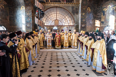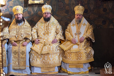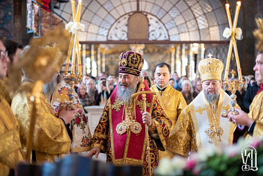 Его Блаженству сослужили наместник монастыря митрополит Вышгородский и Чернобыльский Павел, председатель Отдела внешних церковных связей митрополит Луганский и Алчевский Митрофан, архиепископ Бучанский Пантелеимон, епископ Белогородский Сильвестр и духовенство обители.