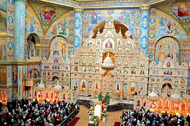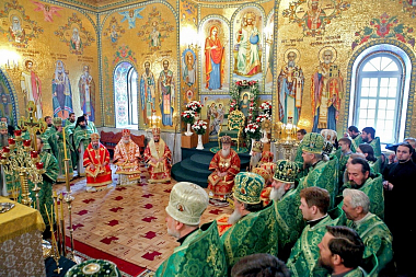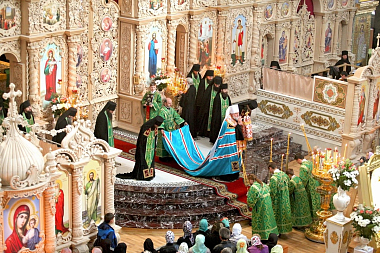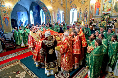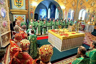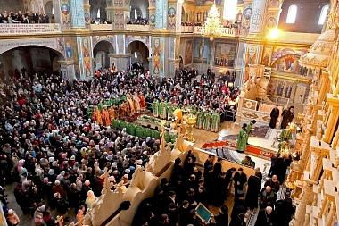 Праздничное богослужение совершалось перед ракой с цельбоносными мощами преподобного Амфилохия Почаевского, установленной в центре собора.