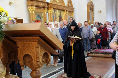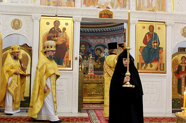 Затем в Кресто-Воздвиженском соборе монастыря архимандрит Никодим (Генералов) отслужил акафист святым первоверховным апостолам Петру и Павлу.