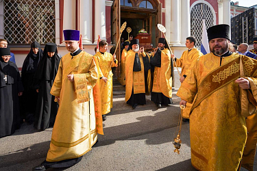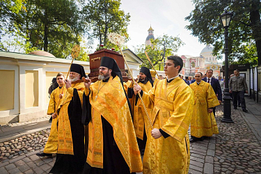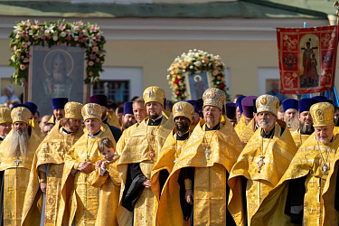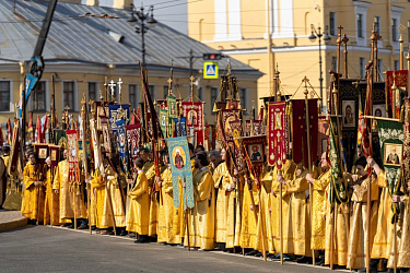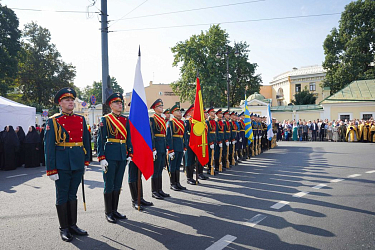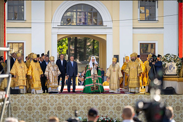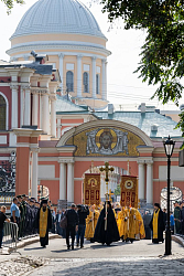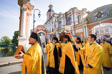 По окончании Литургии Предстоятель Русской Православной Церкви возглавил крестный ход c мощами благоверного князя Александра Невского из Благовещенского храма на площадь Александра Невского.