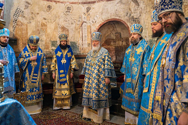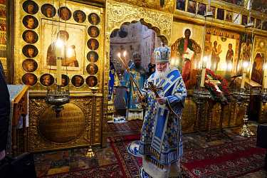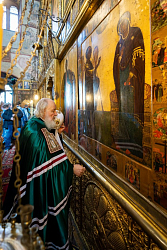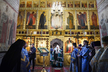При пении величания «Архангельский глас» Святейший Патриарх Кирилл поклонился иконе Благовещения Пресвятой Богородицы в местном ряду иконостаса.