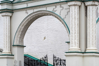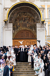 По традиции после богослужения в праздник Благовещения Святейший Патриарх Кирилл вместе участниками молодежного движения «Патриаршие добровольцы» и благочестивыми верующими выпустил в небо голубей со ступеней Благовещенского собора.