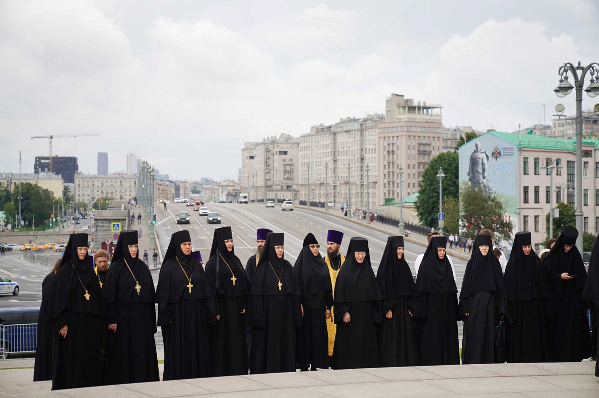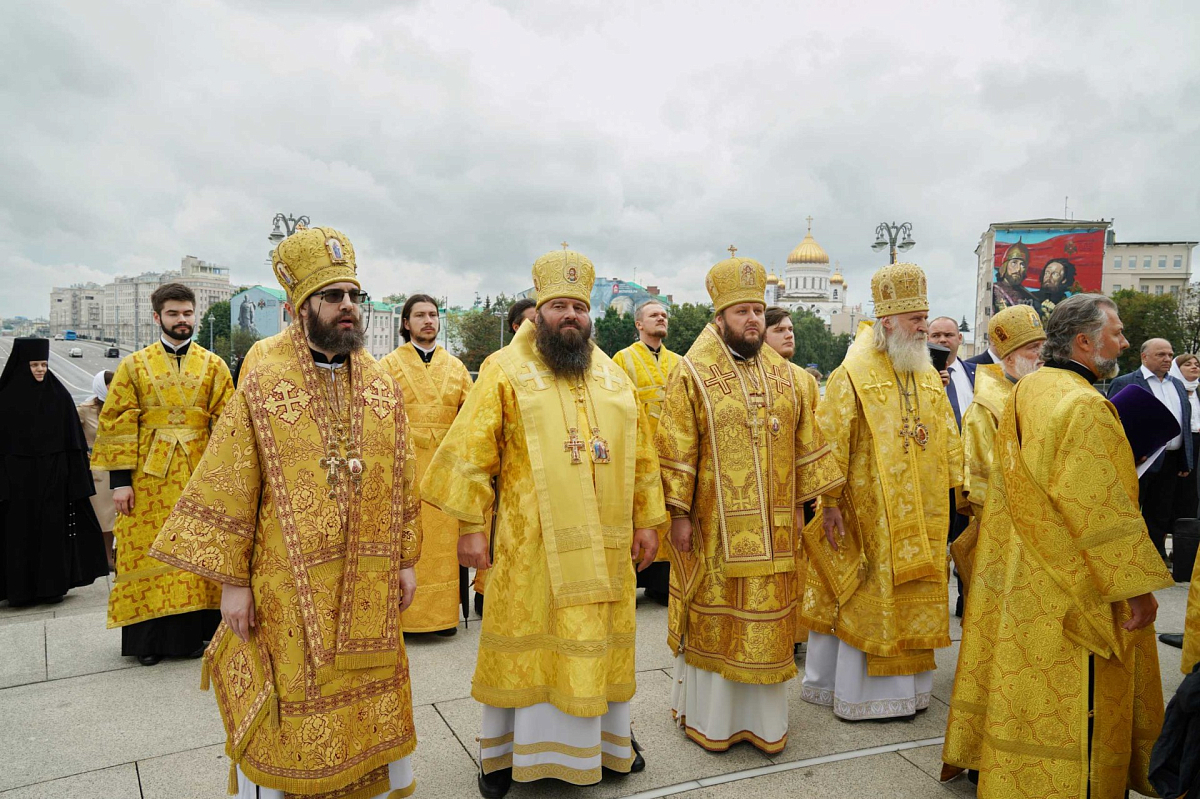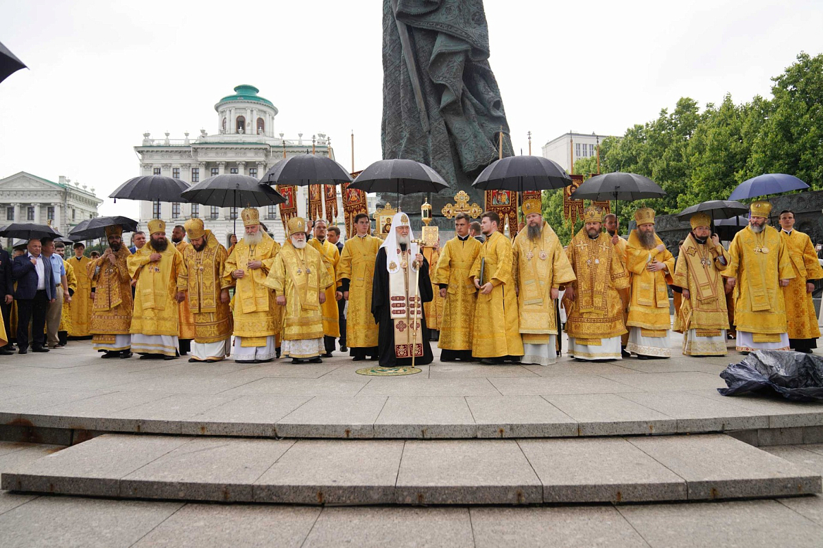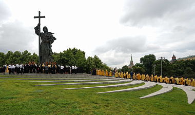 Далее состоялся крестный ход через Боровицкие ворота Кремля к памятнику равноапостольному великому князю Владимиру, где Святейший Патриарх Московский и всея Руси Кирилл возглавил молебное пение.