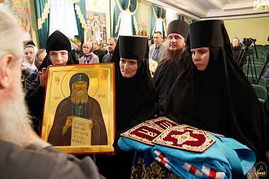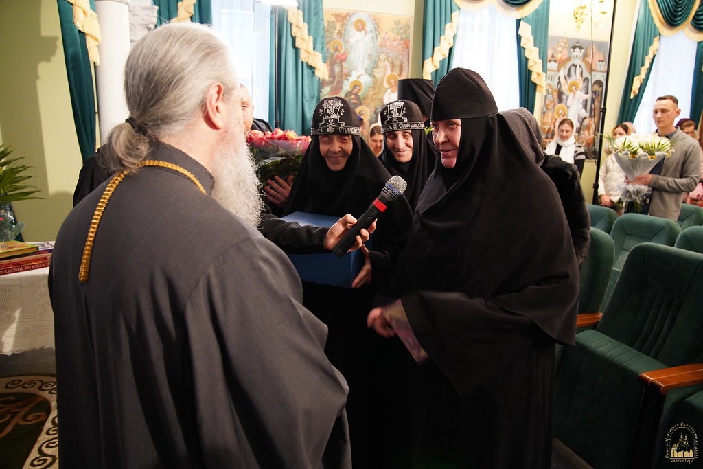 По окончании богослужения братия и гости обители собрались в актовом зале Святогорской лавры, чтобы поздравить владыку Арсения с 25-летним юбилеем его наместничества.