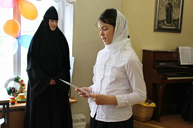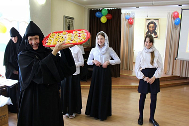 По традиции ребята поздравили Матушку со Светлым Христовым Воскресением и преподнесли сестрам обители сладкие подарки, сделанные своими руками.