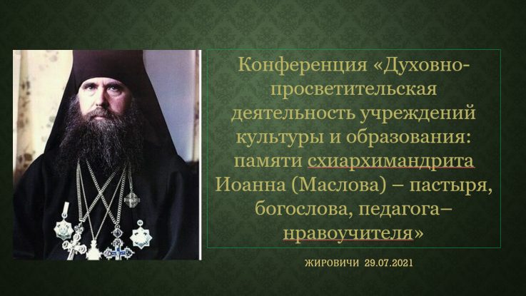 29 июля 2021 года по благословению архиепископа Новогрудского и Слонимского Гурия в Свято-Успенском Жировичском ставропигиальном мужском монастыре состоялась конференция на тему «Духовно-просветительская деятельность учреждений культуры и образования: памяти схиархимандрита Иоанна (Маслова) – пастыря, богослова, педагога–нравоучителя», посвященная 30-летию со дня кончины схиархимандрита Иоанна (Маслова).