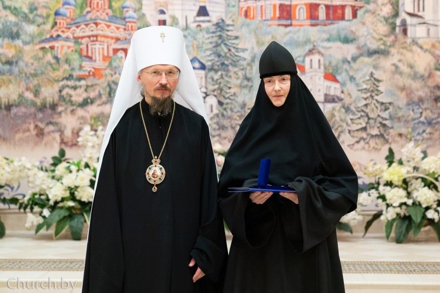 Затем Патриарший Экзарх вручил медаль преподобной Евфросинии Полоцкой заведующей библиотекой Минского прихода в честь Покрова Пресвятой Богородицы Ираиде Владимировне Уржинской и орден преподобной Евфросинии Полоцкой заведующей библиотекой Минского прихода иконы Божией Матери «Всех скорбящих Радость» Светлане Федоровне Виноградовой за добросовестные деяния на ниве духовно-нравственного воспитания, вклад в сохранение традиционных ценностей в обществе.