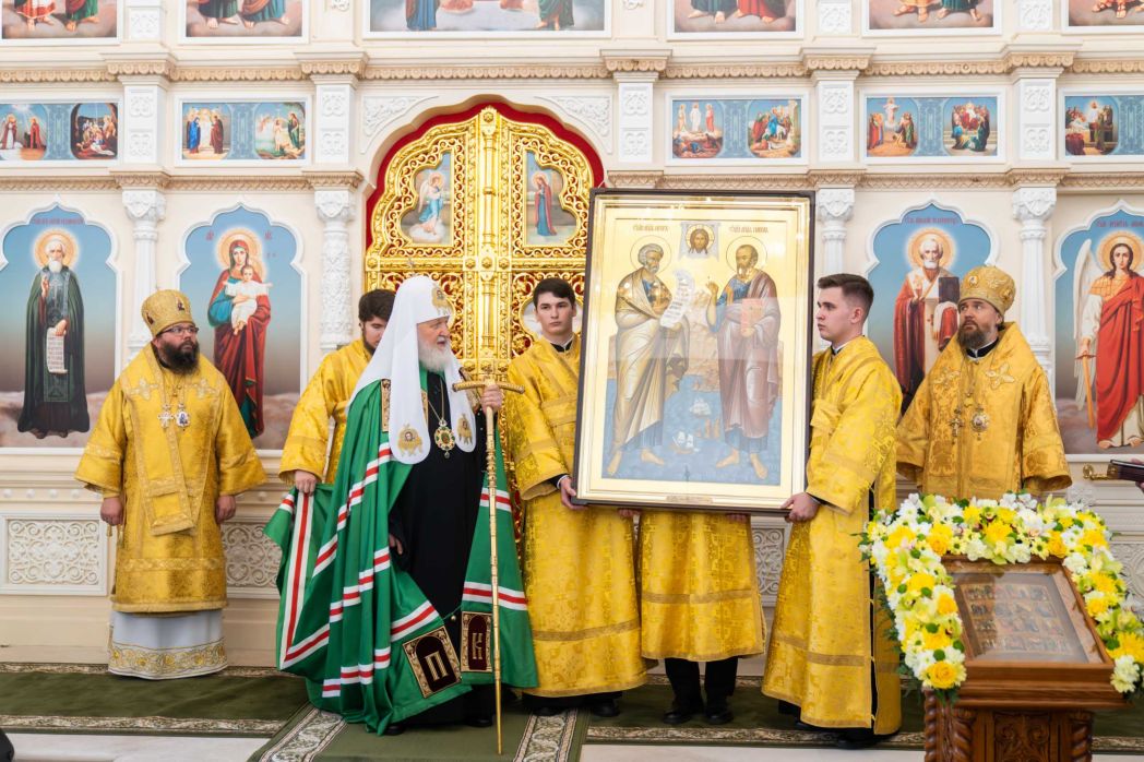 В знак благодарности я бы хотел преподнести эту роскошную икону, изображающую святых первоверховных апостолов Петра и Павла. Пусть она займет достойное место в этом святом храме. Прикладываясь к этому образу, вспоминайте и этот замечательный день, замечательный праздник освящения сего святого храма, и в молитвах не забывайте своего Патриарха. Храни вас всех Господь!