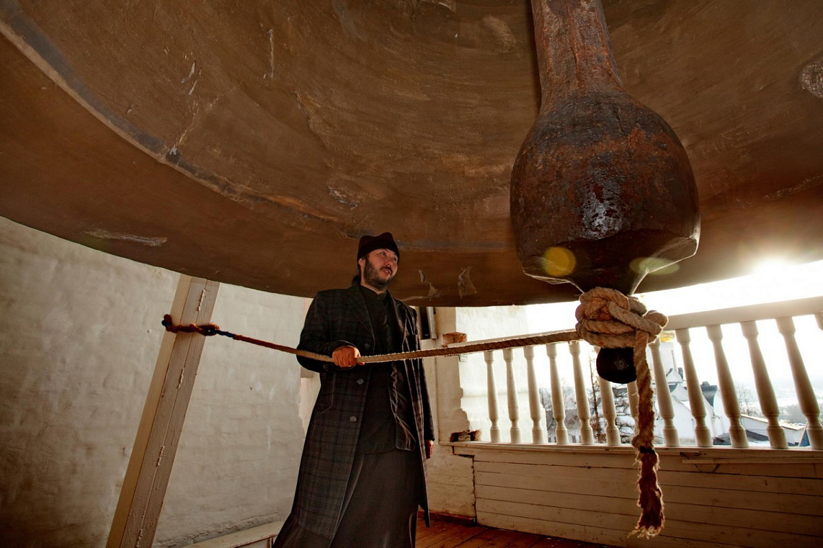 ‒ Колокол здесь был установлен в 1668 году. Его вес равнялся 35-ти тоннам . К сожалению, в 1941 году, во время эвакуации монастырского имущества колокол уронили и разбили. Нынешний отлит в 2003 году на Воронежском заводе. И если предшественник был самым звучным на Руси – говорят, его звон долетал до самой Москвы – то новый поначалу был немым. Представляете, он не издавал никаких звуков. Только с завода – и никакого звона. Приехали специалисты, сделали несколько надпилов – и колокол заработал.