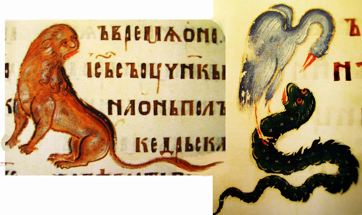 Первый семестр был посвящен работе акварелью. Самые первые занятия – рисованию отдельных элементов, взятых с икон или росписей. Например, какая-нибудь сабелька воина, или шапка князя, кустарник и домик с иконы XV века. Далее для цельных композиций идеально подошли самые простые древнерусские рисунки буквиц. Это копии буквиц преподобного Андрея Рублева: «Лев» и буквица «Цапля, ухватившая змею». Дело в том, что буквицы просты для копирования и в то же время интересны детям по смыслу и образу, ведь изображаются там, как правило, птицы и звери.