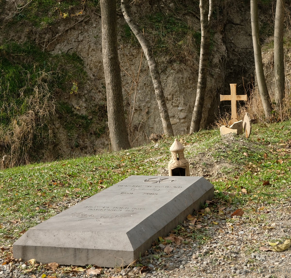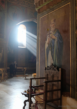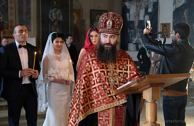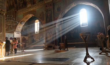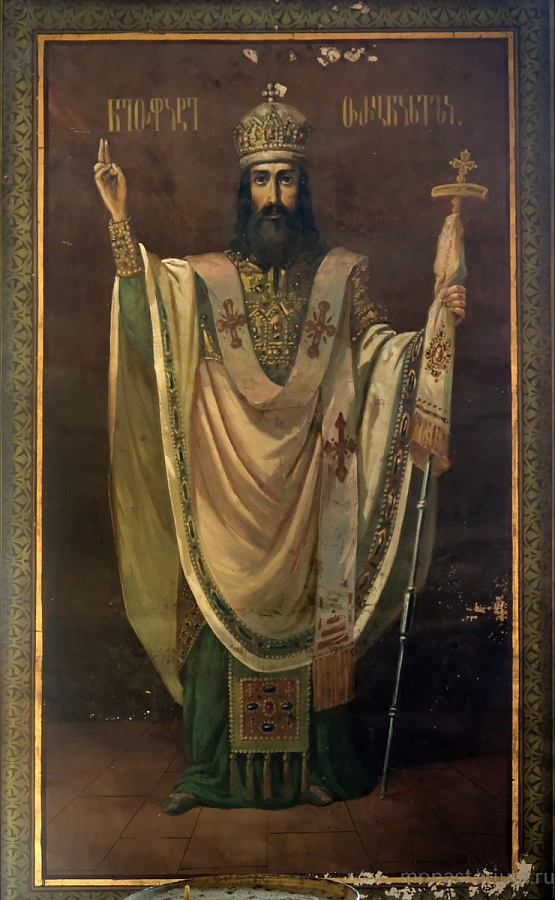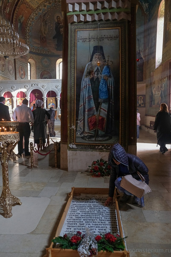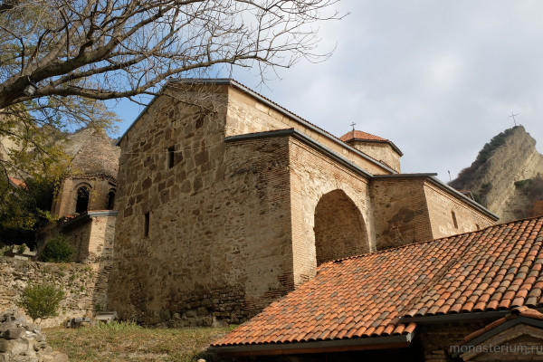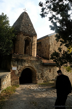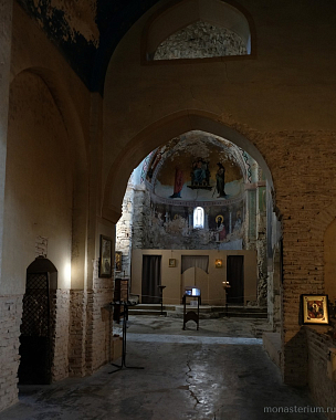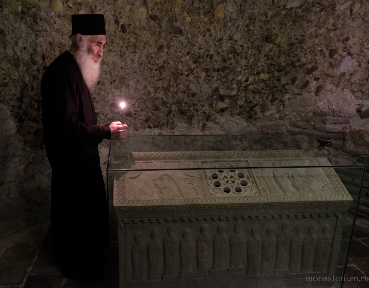 Предание говорит, что при преподобном были построены три храма: Иоанна Предтечи, Пресвятой Богородицы и Пресвятой Троицы. Там, где могила преподобного, храм VI века. А храм Пресвятой Богородицы, где мы сейчас беседуем, XII века, построил грузинский царь Давид IV Строитель. Рассказывают, что храм построен на основании старой церкви, которая была во времена преподобного. Его несколько раз разрушали, особенно в нашествие персидского шаха Аббаса I. В конце XIX – начале XX века этот монастырь восстановил епископ Гурийско-Мингрельский Александр (Окропиридзе). Сейчас он прославлен в лике святых, погребен тоже в нашем монастыре. Он очень благодетельствовал монастырю, при нем сделана роспись стен – русским мастером Андреевым.