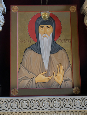 Преподобный Шио творил много чудес, и многие люди приходили к нему для исцеления. Но в лесу на них часто нападали дикие звери, поэтому преподобный призвал однажды всех хищных животных, которые были в этой местности, и велел им уйти. Оставил только одного волка, чтобы он пас монастырское стадо ослов. Этот волк изображен рядом с ним на иконах. И, обратите внимание: святой кадил голой рукой, на иконе он держит уголь на руке, и так кадит. (По преданию, кадильный дым указал ему место постройки монастыря.)