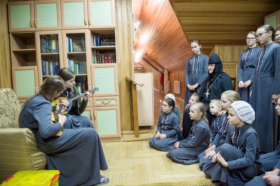 Девочки получают и хорошее светское образование, в том числе музыкальное. Учатся по программе общеобразовательной школы, а поскольку классы у нас небольшие, то получается почти индивидуальное обучение. На уроках труда овладевают навыками кройки и шитья, учатся готовить, что-то делать по хозяйству. В монастыре несут посильные послушания: в трапезной накрывают и убирают за собой столы, в храме церковничают. Занимаются вокалом, готовят выступления к праздникам обители: поют, танцуют и играют на музыкальных инструментах.
