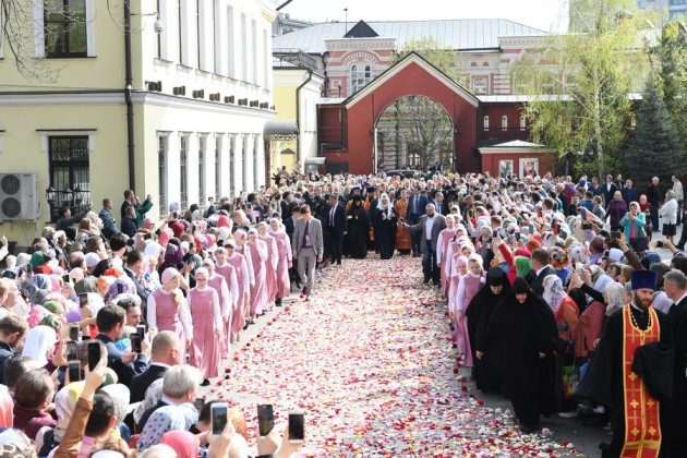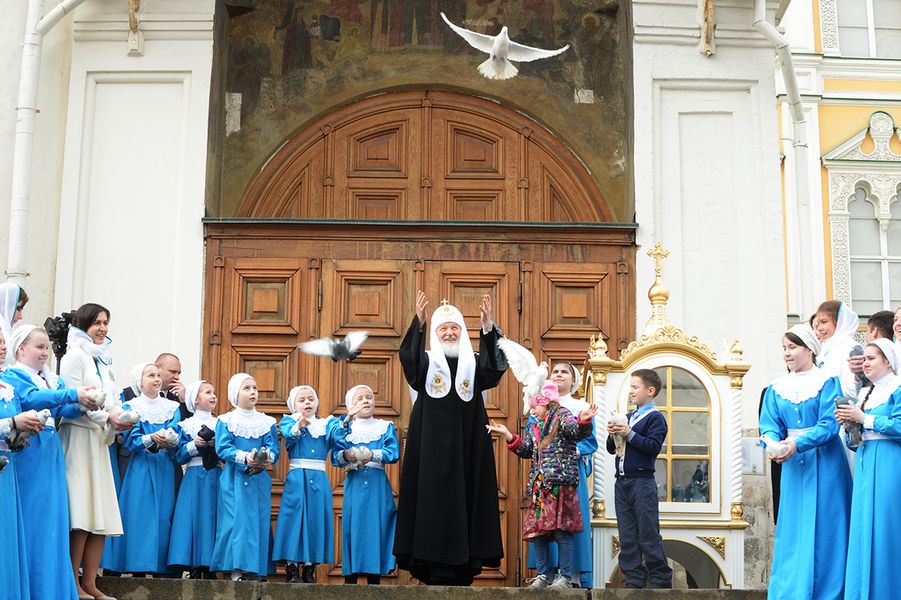 Также Предстоятель вместе с детьми Покровской обители выпускает голубей в праздник Благовещения Пресвятой Богородицы в Кремле.