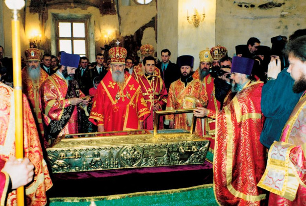Ну а уже утром, начиная с 6-7 часов, монастырь вновь оживает, начинается обычная праздничная суета: каждую минуту прибывают новые и новые паломники, которые вскоре заполняют всю территорию обители, так что даже очередь к мощам в монастырском парке стоит в несколько рядов.