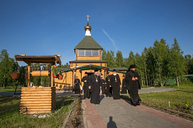 А то, что конкретно сделал дорогой владыка для созидания нашей обители и ее благоукрашения, какие труды он на это положил, мне сложно оформить в стройные мысли и тем более описать словами. Так много им делалось изо дня в день, и в будни, и в праздники! Причем удивительный был момент: что бы прежде ни планировалось на том достаточно большом участке земли, принадлежавшем кафедральному собору (например, создать детский лагерь для воспитанников православной гимназии из Ханты-Мансийска) ничего не получалось. Как-то не складывалось... Но с момента строительства храма в честь святителя Димитрия, митрополита Ростовского (особенно после того, как мы обратились к владыке Ярославскому Пантелеимону, ныне находящемуся на покое, и с его благословения была выделена частичка святых мощей святителя Димитрия) всё стало двигаться вперед. Одним из благодетелей, кто изъявил желание построить этот храм, был Дмитрий Мизгулин, на то время являвшийся председателем правления Ханты-Мансийского банка. С его помощью было положено начало.