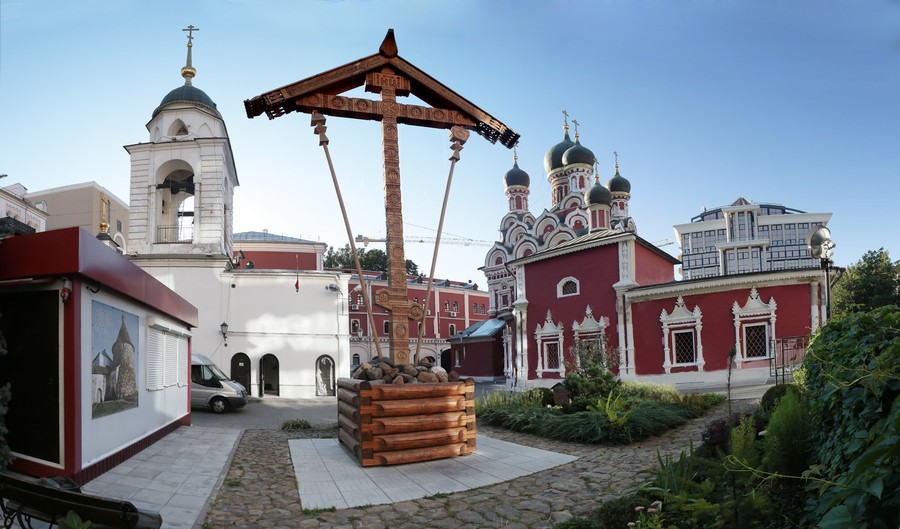 Когда мы сюда пришли в 1992 году, в церковном здании располагались запасники Дирекции художественных выставок Художественного фонда России. От прежнего убранства храма, от икон ничего не осталось, только роспись в куполе четверика, которую мы позднее отреставрировали. Мы все думали, как сделать так, чтобы храм и его территория «осоловели». Зародилась мысль воздвигнуть крест, подобный тем поклонным крестам, которые стоят на Соловках. Традиция их устанавливать существовала с давних пор – до 1917 года на территории архипелага поклонных крестов насчитывалось до трех тысяч. В итоге поставили девятиметровый крест, который изготовлен в монастырской кресторезной мастерской на Соловках. Его центральный столб – из дерева, выросшего на Соловках, и камни, которыми он заложен у основания, тоже соловецкие.