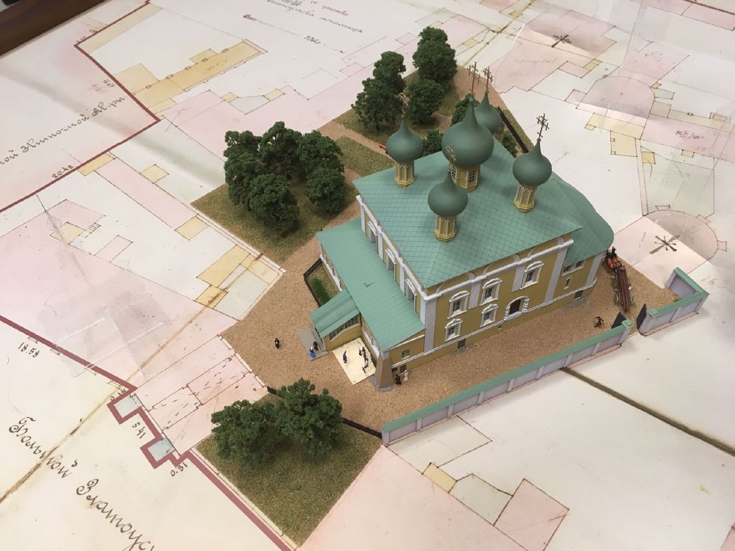 Слава Богу, люди приходят. Молодежь тоже интересуется. Экскурсия включает в себя и посещение нашего музея «Разрушенный, но живой». Он был создан при поддержке первого гранта мэра Москвы. В небольшом зале много интересных артефактов, найденных на месте бывшего монастыря и поблизости от него, что особенно ценно. Однако сейчас хочу сказать о другом. О первом шаге на пути к изготовлению макета обители с ее обилием церквей (в масштабе 1:160 и размером 1х1 метр). Это была наша давняя мечта – сделать такой проект, чтобы как-то всё визуализировать. Но проект по деньгам дорогой, поскольку работа очень кропотливая. Во-первых, сама подготовка чертежей макета включает исследование архивного материала, анализ описательных документов, сохранившихся фотоматериалов, чертежей храмов, планов территории монастыря и требует понимания законов архитектуры. Во-вторых, макет изготавливается вручную – из огромного числа мелких деталей. Их надо вырезать, склеить и вдохнуть какую-то жизнь, разместив, например, недалеко от собора людей и лошадок, везущих на телеге дрова. И вот в начале этого года макет пока лишь соборного пятиглавого храма во имя святого Иоанна Златоуста мы смогли показать участникам VII научно-практической конференции «Златоустовские чтения». Дальше, Бог даст, Благовещенскую церковь поставим. И так шаг за шагом… Макет собора выполнен в мастерской Вадима Пчелкина, ранее изготовившего макет Страстного монастыря.