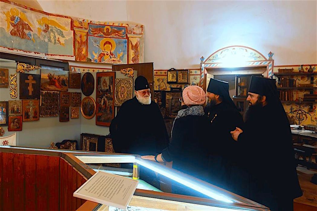 Музейная экспозиция размещена высоко под куполом храма, до нее три крутых лестничных пролета. Пока вы поднимаетесь в музей, вы уже погружаетесь в его атмосферу. Вдоль стен по лестнице расположены картины, которые в дар музею преподнесли художники из разных городов нашей страны, а также Украины и Белоруссии. Это живописцы, с которыми наш монастырь много лет сотрудничает в рамках Международного пленэрно-выставочного проекта «Русская Атлантида», организованного Санкт-Петербургским центром гуманитарных программ под руководством заслуженного работника культуры Российской Федерации В.В. Васильева.