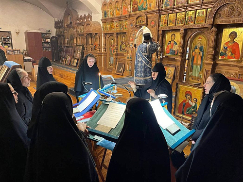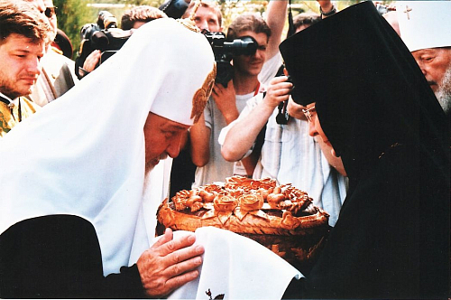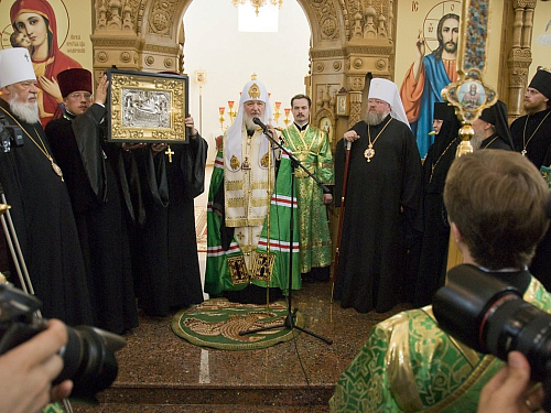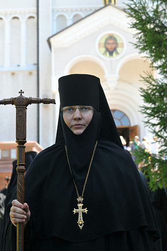 ...В соборе Святейшего встречали сонм архиереев, священников и прихожане обители. Было совершено малое освящение собора, затем все прошли к часовне, где похоронен наш старец Зосима, отслужили заупокойную литию. Потом направились в Трапезный храм на праздничную трапезу. Я шла рядом с Патриархом, мы очень тепло общались: он спрашивал меня о моем образовании и о том, чем и как мы занимаемся с сестрами. Я рассказывала об устройстве монастыря, о назначении близлежащих корпусов, показывала их. После этой беседы у меня исчезло внутреннее напряжение, поскольку я четко и ясно осознала, что рядом наш отец, который глубоко во всё вникает и искренне интересуется нашей жизнью. После трапезы мы подарили Его Святейшеству изображение Успения Божией Матери, изготовленное руками сестер. В память о посещении обители Патриарх Кирилл подарил нам старинный образ Успения.