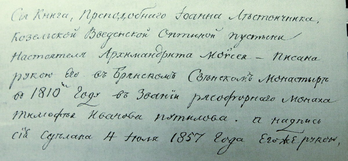 Если вспомнить 90-е годы, то печатали тогда много всего и без разбору: попалась какая-то книга, не выходившая в печать долгие годы в советское время, ее тут же издавали – нередко без указания, чей это перевод. А в Оптиной пустыни к переводческой деятельности относились глубоко и серьезно. Под руководством преподобного старца Макария здесь велась активная деятельность по переводу и изданию святоотеческих творений. Именно в Оптиной был подготовлен лучший перевод «Лествицы» на русский язык, высоко оцененный как современниками, так и потомками. Вокруг старца образовалась группа помощников, в которую входили отец Амвросий (Гренков), впоследствии знаменитый старец и преемник отца Макария; отец Леонид (Кавелин), впоследствии наместник Троице-Сергиевой Лавры; отец Климент (Зедергольм), магистр классической филологии Московского университета; отец Ювеналий (Половцев), впоследствии архиепископ Литовский и Виленский. В Оптиной пустыни имелись рукописные переводы аскетической литературы, сделанные преподобным Паисием (Величковским), некоторые греческие рукописи и еще другие, славянские. Дело в том, что славянский язык к концу XIX века для многих перестал быть понятен...