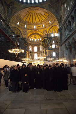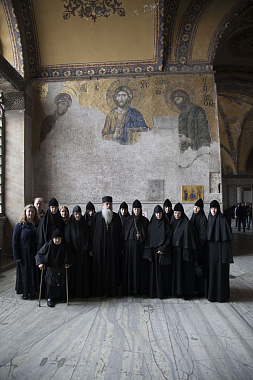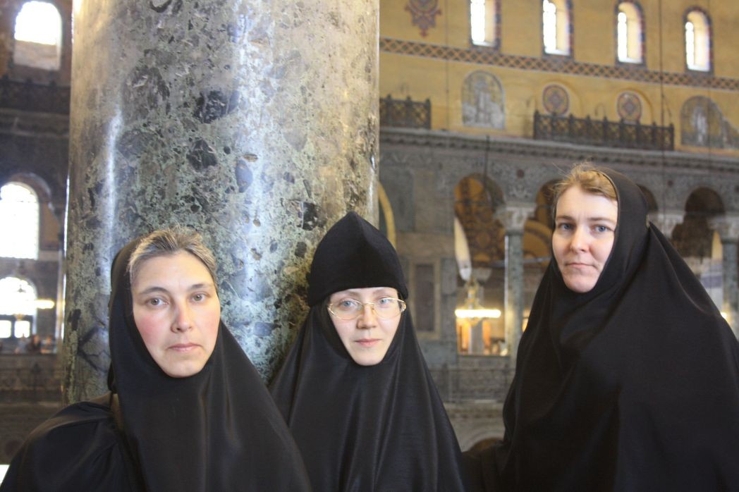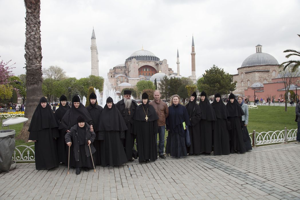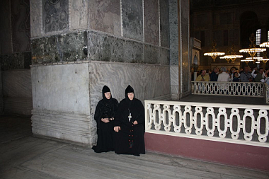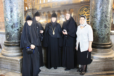 Вообще все наши паломнические поездки по святым местам Византии можно назвать чудом Божиим. Одна из них была настолько примечательной, что не могу не рассказать о ней. Мы с сестрами испросили благословения на паломничество в Грецию у нашего правящего архиерея – архиепископа Ярославского и Ростовского Кирилла (ныне -он митрополит Казанский и Татарстанский). Проходит два дня, владыка звонит и говорит: «Нет, матушка, в Грецию вы не едете – вы поедете вместе с нами. Я был на приеме у Святейшего Патриарха Кирилла, и он меня посылает к христианским святыням Константинополя, а также в Эфес и Миры Ликийские (ныне г. Демре), где на праздник Святителя Николая мы должны отслужить Божественную Литургию». Владыка взял свой клир, певчих, благотворителей, так что уже не десять сестер отправились в то паломничество. Встречавший нас в аэропорту Стамбула длинный Икарус оказался полон! И представьте себе такую картину: сорок пять человек из России, во главе с архиереем, входят в храм Святой Софии. С каким восторгом смотрели на нас иностранцы! Некоторые подходили и говорили, что появилось ощущение, будто они попали в те давние времена, когда Константинополь являлся опорой Православия. А лет за семь до этого я частным образом побывала в Стамбуле и, попав в «храм храмов», где всё дышало живой историей христианской веры, где воздух был родным, родными были древние стены, которые хотелось целовать, возмечтала в душевном порыве: «Вот бы сюда приехать с монашествующими, со священниками!» (О священноначалии и помыслить тогда не могла). И свершилось! Просто удивительно, как Господь слышит наши воздыхания!