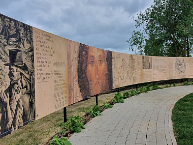Когда в цехе увеличения уже набрали фигуру, Сергей Юрьевич заболел ковидом. Девять дней он находился в реанимации, потом еще месяц лежал в больнице. А сроки поджимали. Выйдя из больницы, он тут же приступил к работе – забрался на трехметровую скульптуру с кислородным аппаратом. «Я ходить не мог, говорить не мог, а лепить надо было», – рассказывает режиссеру наш давний помощник и друг, сумевший воплотить в памятнике с высокой степенью художественного совершенства образ Достоевского, как путеводца в Царство Небесное. Писатель со свечой в руках спускается по лестнице. Почему со свечой? Но ведь для того, чтобы выйти к свету, нужно спуститься вниз, увидеть свой ад, свои грехи... Как сказал Сергей Юрьевич, это то, что Федор Михайлович с нами делает! За скульптурой – пятиметровая кирпичная стена, раскрытая «книгой». Золотом сияют на ней слова старца Зосимы из «Братьев Карамазовых»: «Мир есть рай, ключи у нас». Полукругом вокруг памятника расположены стенды с биографическими сведениями о писателе и отрывками из его бессмертных произведений.