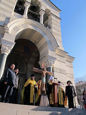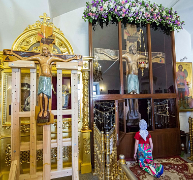 Сейчас заканчивается заливка перекрытия нижнего храма, алтарь которого по нашему замыслу будет посвящен Царственным страстотерпцам. А два боковых придела – Божией Матери и святителю Николаю Чудотворцу. Ведутся работы по проектированию его внутреннего убранства. Обозначилась, можно сказать, глобальная тема. У Животворящего Креста Господня мы говорим с людьми о спасении. А оно состоит, прежде всего, во взаимоотношениях со Христом, Спасителем мира, распятым на Кресте и воскресшим. Который пришел на землю, чтобы принести искупительную Жертву за род человеческий. Каковы эти взаимоотношения? Эти взаимоотношения начинаются с искреннего покаяния. «Придите и очиститесь», – говорит в своей проповеди учитель покаяния пророк Иоанн Предтеча. Многие слезы покаяния видел и видит наш Годеновский Крест! Живая проповедь Спасителя, не ослабевая, льется от Распятого Христа и часто не нуждается в посредниках. На глазах люди, еще вчера далекие от Церкви, делаются исповедниками веры, и со слезами молятся у Святого Распятия. Она, эта живая проповедь, и натолкнула нас на мысль о строительстве монументального храма в честь Христа и Его ипостаси – Софии Премудрости Божией. Молитвами Пресвятой Богородицы, Господи, помоги нам!