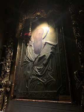 Но вернемся к нашим дням. В 2019 году по благословению митрополита Феофана Казанского и Татарстанского при содействии благотворителей нами была заказана большая икона «Собор Оптинских старцев», с отработанной иконографией, которая пишется во Введенском ставропигиальном мужском монастыре Оптина пустынь. Поскольку монастырь ставропигиальный, то было подано прошение в Московскую Патриархию о выделении частичек мощей Оптинских старцев. В сентябре этого года на имя владыки Феофана пришло письмо за подписью председателя Синодального отдела по монастырям и монашеству архиепископа Каширского Феогноста, в котором сообщалось, что Святейший Патриарх Московский и всея Руси Кирилл дал свое благословение. Мы с радостью отправились в Оптину пустынь, где встретились с ее наместником, епископом Леонидом, и в дар от Раифского монастыря передали моей дорогой альма матер икону преподобного Гавриила Седмиезерного с мощевиком. Богу было угодно, чтобы прибытие мощей в Раифу и написание иконы пришлись на Собор Оптинских старцев. Икону мы торжественно освятили, совершили молебен и определили для нее место в пятиглавом Троицком соборе, справа от входа.