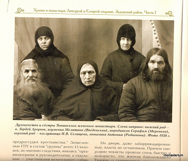 Здесь сестры пострадали за веру… 10 февраля 1930 году священника Гордия, игумению Мелетину с сестрами, иеродиакона Серафима подвергли аресту. Все они на допросах мужественно исповедали свою веру. Матушка Мелетина несмотря на частые избиения продолжала совершать в камере келейное правило, утешала узников. Вместе с отцом Гордием она приняла мученическую кончину в Ельце. Их молитвами и милует нас Господь.