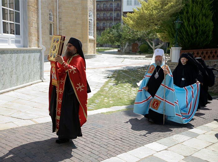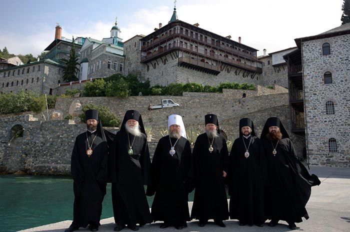 Более четверти века в Русской Православной Церкви существует традиция: ежегодно Cвященноначалие направляет для участия в престольном празднике Русского на Афоне Пантелеимонова монастыря, по новому стилю ― это 9 августа, официальную делегацию в составе архипастырей, священнослужителей и мирян. В текущем году по благословению Святейшего Патриарха Московского и всея Руси Кирилла паломническую группу довелось возглавить мне. Решением Священного Синода в поездке на Святую Гору приняли участие: митрополит Черновицкий и Буковинский Мелетий, архиепископ Женевский и Западно-Европейский Михаил, епископ Россошанский и Острогожский Андрей, епископ Владикавказский и Аланский Леонид, епископ Слуцкий и Солигорский Антоний, заведующий сектора протокола Отдела внешних церковных связей Московского Патриархата игумен Феофан (Лукьянов). Иерархов сопровождали священнослужители и миряне. Всего на праздник великомученика и целителя Пантелеимона нас приехало 17 человек. Если посмотреть на состав делегации, то увидим, что он отображает обширность канонической территории нашей Церкви. Митрополит Мелетий представлял Украинскую Православную Церковь, владыка Михаил ― Русскую Православную Церковь Заграницей, епископ Андрей ― епархию Центральной России, входящую в состав Воронежской митрополии, Преосвященнейший Леонид ― епархию на территории республик Северного Кавказа, владыка Антоний ― Белорусский экзархат, мое служение совершается в Казахстанском митрополичьем округе.