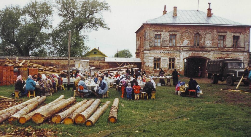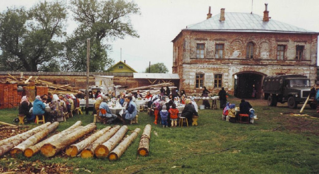 Ее забыть невозможно, как и те трудности, что предваряли службу и разрешились чудесным образом. Август 1992 года. Мы собирались отправиться в разрушенный монастырь на катере, но в то время горели леса и такой смог спустился на город, что плыть было невозможно. Два часа простояли на пристани с Чашей, просфорами и подумали уже, что службу отменим. У меня с собой была Смоленская икона Божией Матери на металле – маленькая, старинная, я всегда ее раньше брала в путешествия. И эта первая Литургия после нашего приезда должна была состояться как раз на Смоленскую. На пристани все заволокло дымом, мы устали, и попросили капитана разрешить нам пройти на катер, чтобы немножко отдохнуть. Он так смешно сказал: «Ладно, кто в платочках, заходите». Спустились мы в каюту, повесили на гвоздик мою иконочку и начали служить молебен. Через десять минут появляется удивленный капитан и говорит: «Туман рассеялся, плывем». Несколько лет потом он возил нас бесплатно, настолько его впечатлила эта история. А у нас на первых порах вообще ни копейки не было, и такое благодеяние с его стороны мы воспринимали с благодарностью. Вот в память об этой Литургии в центральном иконостасе нашего Вознесенского собора, который нам в Троице-Сергиевой лавре прекрасно написали, слева от Царских врат – Смоленская икона Божией Матери. Работа иконописца Екатерины Чирковой – ну просто музейная!