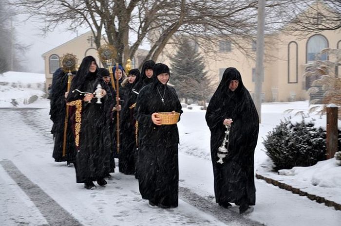 Когда у нас не было ремонта… давайте я расскажу о том, как мы жили, когда у нас не было ремонта и был священник… сейчас у нас временно нет священника. Так вот, обычно наш день начинается в 6 часов утра Литургией или молебном, и после этого бывает трапеза, а потом мы выходим на послушания. Следующая трапеза в 1 час дня, а затем мы служим вместе вечерню и малое повечерие, а после этого уединяемся в своих кельях для отдыха. Потом снова трудимся, молимся.