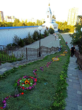 Думается, прежде всего лестница, называемая нами (не официально, конечно) митрополичьей. Начну рассказ о ней с того, что владыка Меркурий, который постоянно интересуется духовной стороной жизни, встречается с сестрами в непринужденной будничной обстановке, беседует с ними – он, наш владыка, столь же активно участвует и в благоукрашении территории монастыря. За эти годы много сделано по его совету и благословению, в том числе и эта красивая изящная лестница, соединяющая верхнюю территорию нового монастырского Троицкого собора и нижнюю – со старинным Иверским храмом. В итоге получилось не просто украшение всех наших холмов и ландшафтных террас, но, повторюсь, чрезвычайно удачное решение владыки соединения двух храмов. И как удобно идти по ступенькам крестным ходом в различные моменты монастырских торжеств! Люди любуются и самой лестницей, и – с ее разных уровней – живописными видами монастыря. И непременно фотографируются на память о его посещении.