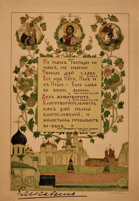 Прекрасно разработано Великой княгиней в 1916 году изображение для листовки Елизаветинского благотворительного общества в Москве и Московской губернии с цитатами из Священного Писания. Елизавета Феодоровна опирается на композицию «Похвала Владимирской иконе Божией Матери («Насаждение древа государства Российского»)» Симона Ушакова, созданной в 1663 году. В своем рисунке она оставляет стены, Успенский собор Московского кремля, который мы видим на иконе, но умножает кремлевские постройки, как бы документализируя изображение, добавляет здания, которые все вместе составляют Кремль – сердце Москвы и России. Так, рядом с Успенским – Архангельский собор, на рисунке виднеется даже фрагмент Сенатского дворца, построенного архитектором Матвеем Казаковым. Среди кремлевских храмов выделяются красным цветом строения Чудова монастыря, в котором находилась усыпальница Великого князя Сергея Александровича. На переднем плане слева – узнаваемые очертания Покровского собора Марфо-Мариинской обители… А еще в самом низу цифры: слева год создания работы, справа 1891 – год, когда Великая княгиня приехала в Москву и приняла православие. То есть ее история оказывается вписанной в общую историю Москвы, России, русской Православной Церкви.