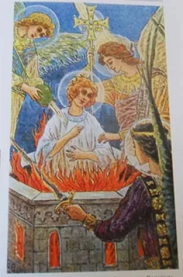 В своих рисунках Великая княгиня тоже опирается на традиционную иконографию христианского искусства, которую она прекрасно знала. Так, изображая мученицу Василиссу в горящей печи, из которой вырываются языки пламени, и ангелов, помогающих святой, она отсылает нас к изображениям Трех отроков в печи огненной, творчески их переосмысляя.