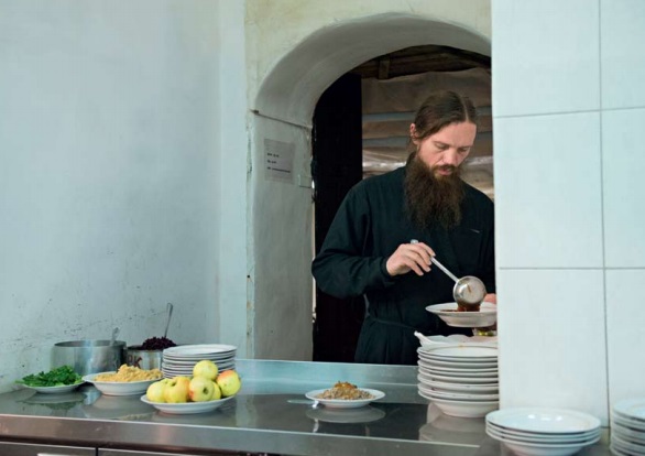 – В Лавре существует особый обычай: между вторым и третьим блюдами тот, кто возглавляет трапезу (лаврский наместник или, если он в отъезде, казначей, или благочинный), звонит в колокольчик; все встают, и возглавляющий произносит короткую молитву: «Молитвами святителя Стефана, епископа Великопермского, и преподобного и богоносного отца нашего Сергия, игумена Радонежского, Господи Иисусе Христе, помилуй нас». Братия говорит: «Аминь» – и садится, – рассказывает иеромонах Архипп.
