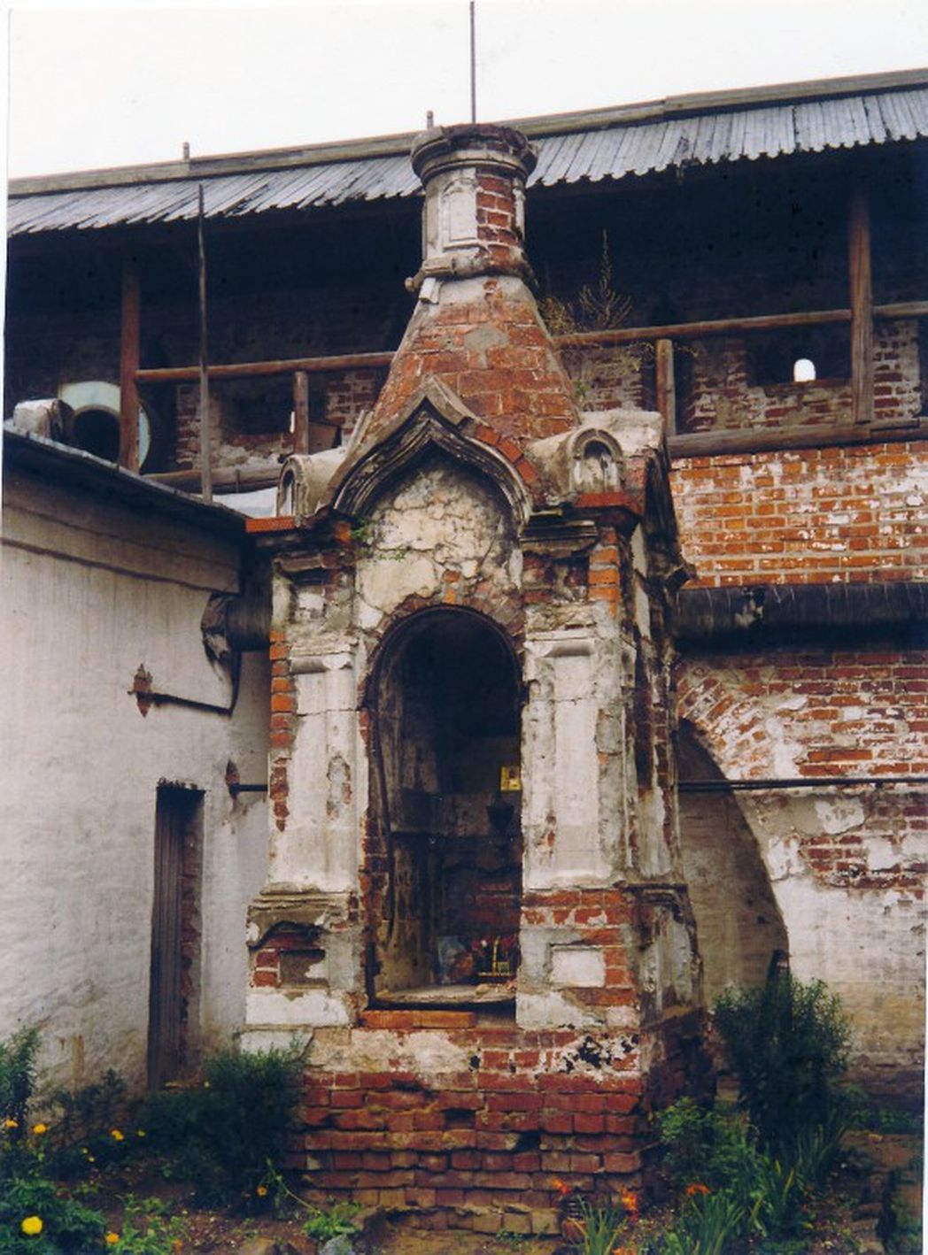 Стены монастыря снаружи были побелены и расписаны крупными изображениями ангелов и святых. Вохровцами ко дням революционных праздников поверх росписей вывешивались красные звезды, которые освещали изнутри лампочками, и красные транспаранты. Такое кощунственное смешение.