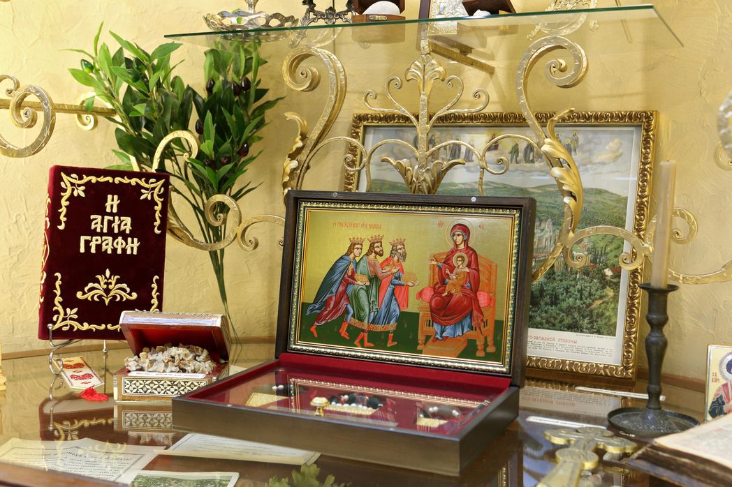 Второй удел Пресвятой Богородицы – Афон – представлен многочисленными святынями, монашеским рукоделием и интересными документами. В центре собраны чудотворные афонские иконы Божией Матери «Иверская», «Всецарица», «Достойно есть», «Игумения горы Афонской», «Геронтисса».