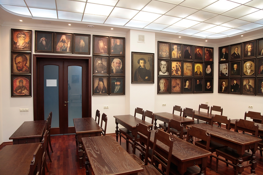 Аудиторию украшает русская иконография Ангелов кисти преподобного Андрея Рублева. А в углу аудитории — облицованная изразцами печь (стилизованная, конечно, но очень уютная).