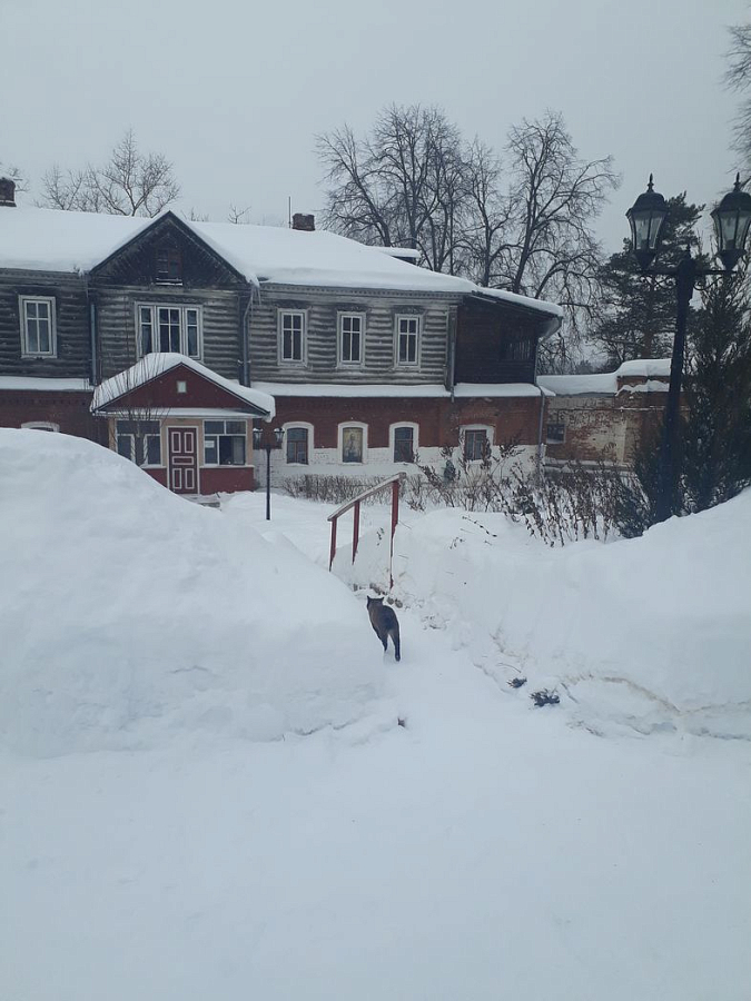 …В монастыре навстречу нам вышел сиамский кот по кличке Оби – верный друг монаха Паисия (Отводчикова): встречает его со службы, провожает на трапезу. Отец Паисий – келарь, и еще несет многочисленные послушания: водит экскурсии, является аптекарем, библиотекарем. Братия немногочисленна, поэтому, по словам отца Паисия, никто без дела не прохлаждается. Отец Паисий уже 12 лет подвизается в монастыре, при этом он самый молодой из братии. После его прихода новыми кадрами обитель не пополнялась. Уменьшается же естественно – из-за того, что насельники уходят в лучший мир…