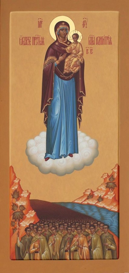 Разговаривая с отцом Михаилом, этот солдатик сказал, что их спасла Божия Матерь. Когда батюшка узнал, что в селе Богородицкое стоит полуразрушенный храм, построенный в XVIIIвеке в честь иконы Божией Матери «Одигитрия», он предложил попробовать написать икону. Он несколько раз говорил о том, что должно быть изображено на иконе: вверху на облаке Пресвятая Богородица, а внизу река из солдат. Первый вариант иконы был написан в мастерской Валерия и Наталии Колтовых, в городе Твери. На иконе Божия Матерь представлена во весь рост, парящей на облаке, с Предвечным Младенцем на руках. Внизу изображена людская река из воинов, идущих на смерть; они изображены с крестами в руках подобно мученикам Севастийским (IV в.), загнанным в ледяное озеро за отказ поклониться языческим идолам.