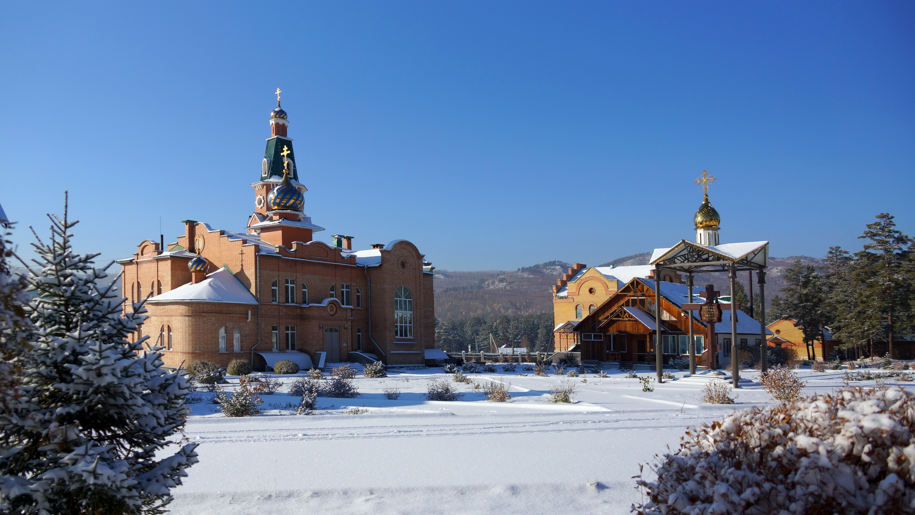 Наш храм – домовый, расположен в одном здании с трапезной, библиотекой и сестринскими кельями. Также в монастыре есть дом для паломников и мастерские, колокольня, архиерейский дом, дом для духовенства, хозяйственные постройки. Несмотря на то что наша обитель довольно молодая, в монастырском храме много чтимых святынь: Распятие с частью Древа Креста Господня, иконы с частицами мощей святителей Николая Чудотворца, Иоанна Тобольского, Димитрия Ростовского, Иннокентия Иркутского, Феофана Затворника, Афанасия Ковровского, преподобных Антония Великого, Сергия Радонежского, Варлаама Чикойского, Софии Суздальской, преподобномучениц великой княгини Елисаветы и Рафаилы, игумении Чигиринской, праведного Симеона Верхотурского, а также – как некий знак духовной преемственности – ковчег с частью Древа Креста Господня и частицами мощей святых, переданный в обитель родственниками одной из насельниц читинского Покровского женского монастыря, разрушенного в 20-е годы ХХ века. Сия святыня благоговейно хранилась в семье инокини в течение всех богоборческих лет и Великим постом 2015 года была передана в обитель. В ковчеге пребывают частицы мощей великомученика и целителя Пантелеимона, святого Косьмы Бессеребреника, преподобномучеников Афонских Евфимия, Игнатия, Акакия, Иакова и святых Исаакия и Иулиании.